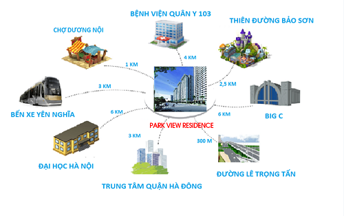 Chung cư Park View Residence Dương Nội tọa lạc tại vị trí đắc địa, nằm ngay trên trục đường Lê Văn Lương kéo dài- Phía Tây Nam: tiếp giáp các khu đô thị mới: Văn Khê, Dương Nội,....- Phía Đông Nam: giáp đường Tố Hữu ( Lê Văn Lương kéo dài - trục đường Láng Hạ kéo dài đi thẳng vào khu vực trung tâm Hà Nội)- Phía Bắc: Khớp nối hạ tầng với khu Thương Mại – Du Lịch – Văn Hóa và đô thị mới phía Tây Hà Nội